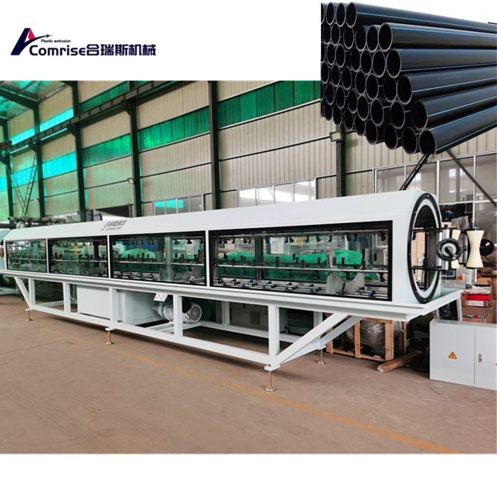 एकल स्क्रू एक्सट्रूडर+सीओ एक्सट्र्यूजन मशीन+पाईप मोल्ड+व्हॅक्यूम साइजिंग बॉक्स+कूलिंग स्प्रे बॉक्स+सहा जबडा क्रॉलर ट्रॅक्टर+चिप फ्री कटिंग मशीन+फ्लिपिंग रॅक.